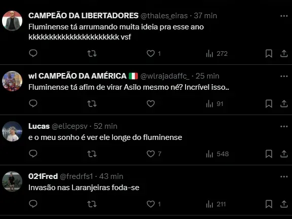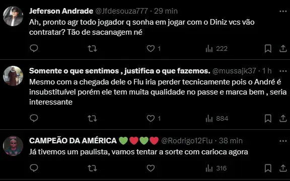 O perfil vai além e destaca que o atleta tem o desejo de ser comandada pelo técnico do Flu: “Sonho do jogador é trabalhar com (Fernando) Diniz. Mais informações no vídeo, link nos comentários”, acrescentou.