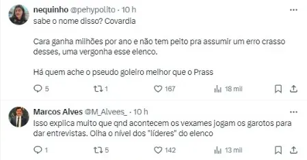 Nas redes sociais, um torcedor arquirrival cobrou Marcos, ex-goleiro e ídolo do Alviverde, sobre a situação do atual titular debaixo das traves, que sempre recebe elogios e acaba sendo defendido, recebendo uma resposta ácida: