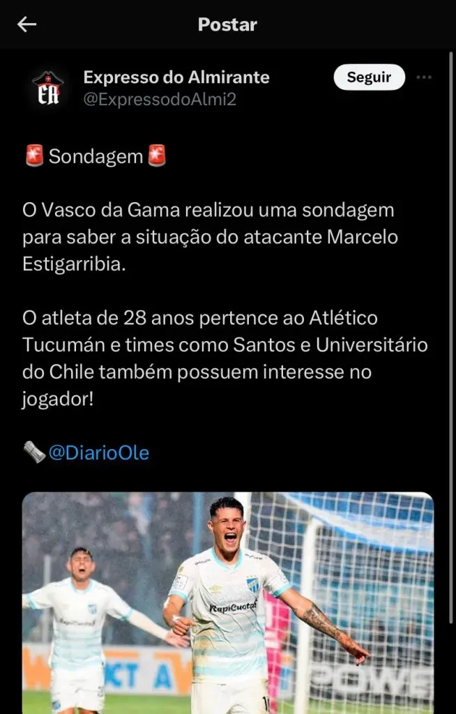 Porém, um novo nome está na mira dos dirigentes vascaínos, pelo menos é o que informa o Diário Olé da Argentina. Porém, no Brasil chegou através de um setorista do Santos, que também disputa o atleta.