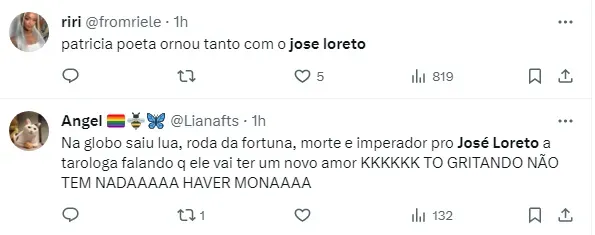 Nesta hora, a taróloga brincou com o signo de Loreto, gêmeos. “Tem que ter senso crítico, geminiano. Para saber o que você vai segurar. Vai chegar de forma inesperada”, afirmou ela. Em alto astral, o ator disse estar de peito aberto para viver uma nova paixão.