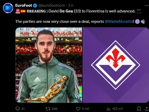 A Fiorentina deve ser o destino do goleiro. Ele não joga desde junho de 2023, quando deixou os Red Devils. Desde então, aguardava uma oportunidade no mercado da bola.