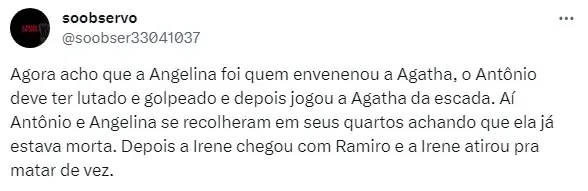 Angelina também contará que ela decidiu envenenar a própria amiga, mas não por ruindade ou algo do tipo. Ela dirá para o delegado que Agatha tentou a matar primeiro, novamente com um chá.