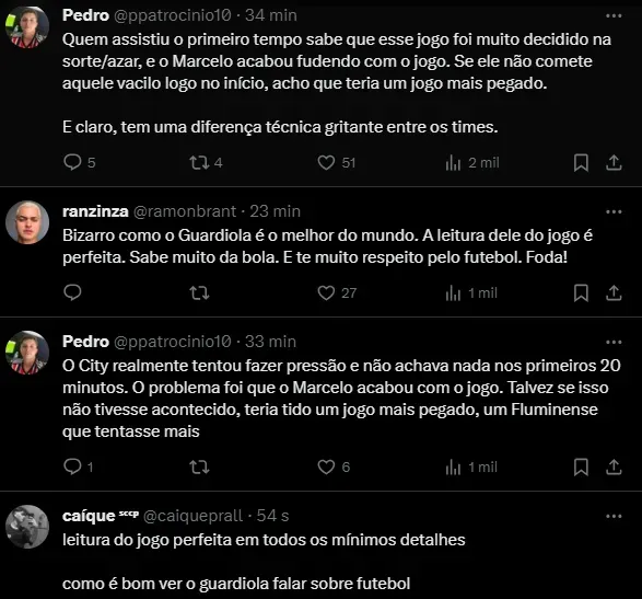 O catalão, considerado um dos maiores treinadores do futebol mundial, também fez questão de elogiar a qualidade tática e técnica do Fluminense e destacou a dificuldade da partida, apesar da vitória por 4 a 0.