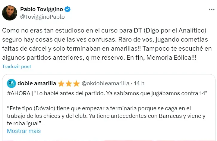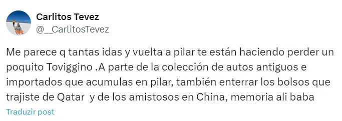 “Me parece que tantas idas e vindas a Pilar estão te fazendo perder um pouquinho, Toviggino. Fora a coleção de carros antigos e importados que acumula em Pilar, também enterrar as bolsas que trouxe do Catar e dos amistosos na China. Memória Alibaba”, rebateu Tévez, uma das contratações mais caras do futebol brasileiro.