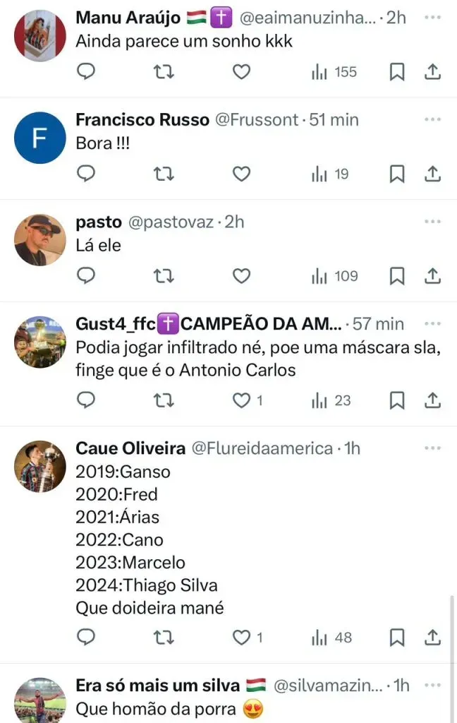 “Em breve nada. Vem jogar hoje”, disse um torcedor. “Agora eu fiquei mais feliz”, disse um membro da torcida. “Vem logo, essa zaga está horrível”, afirmou um membro da torcida. “Vem logo, mostro”, pediu um fanático torcedor do Fluminense