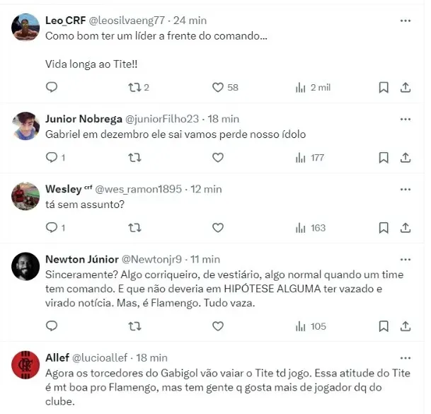“No vestiário, já com música tocando e muita festa pela grande exibição da equipe, Tite chegou e fez uma correção disciplinar a Gabigol, um dos primeiros a deixar o campo após o apito final, na frente de todos”, escreveu Fred Gomes.
