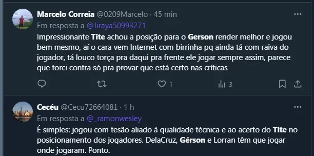 Um dos motivos que vinham fazendo Tite ser vaiado era a insistência na escalação de nomes como Allan e Gerson. Todavia, a escolha pelo “Coringa” acabou se justificando no jogo de ontem e o treinador tratou de dar uma resposta sobre o camisa 8: