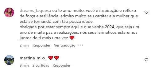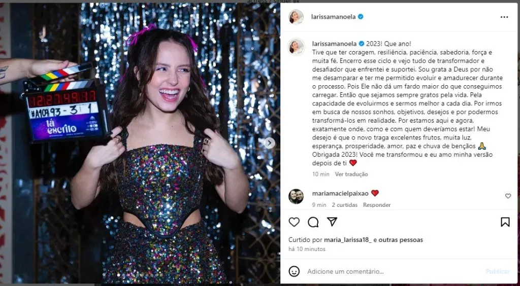 Na publicação nas redes sociais, ela aproveitou o último dia de 2023 para fazer uma reflexão. Larissa não citou o rompimento com os pais, mas falou sobre os desafios que se viu obrigada a ter.