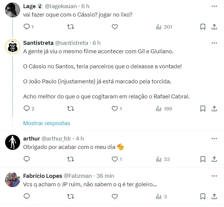 “Cássio + Gustavo Mosquino pelo João Paulo? Loucura?”, sugeriu um perfil do Peixe. Na sequência, a possibilidade foi discutida pelos torcedores de ambos do times.