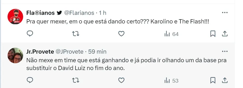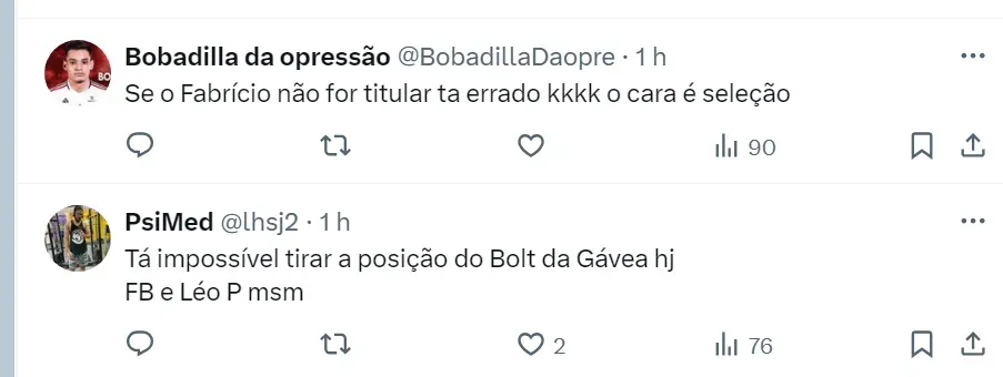 Desta forma, os flamenguistas destacaram no X (antigo Twitter) que é impossível tirar do time titular neste momento Fabrício Bruno, convocado por Dorival Júnior, ou Léo Pereira, que vive grande fase.