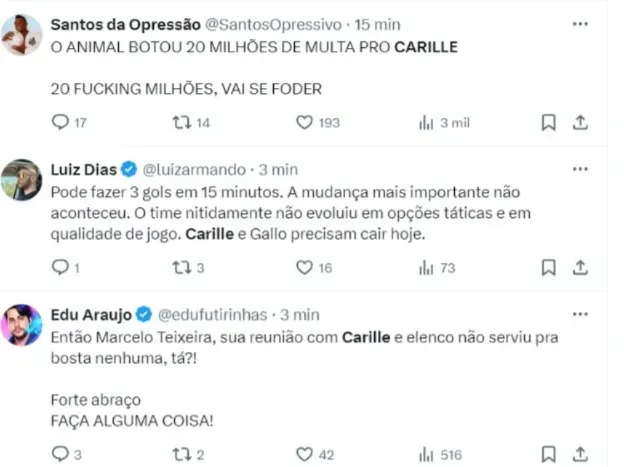 “Então Marcelo Teixeira, sua reunião com Carille e elenco não serviu pra bosta nenhuma, tá?! Forte abraço FAÇA ALGUMA COISA!”, escreveu outro torcedor santista.