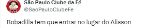 “Alisson se recuperou no São Paulo, ok, lindo, mais tá na hora de tentar algo diferente, coloca o Gallopo ou o Bobadilla por lá”;