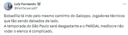 “Tirou o Dorival e agora temos que ficar com esse cara que não usa a base e é arrogante. Não usa a base e nem os melhores que tem. Preza por um time mais competitivo, mas deixa James, Galoppo e Bobadilla no banco”;