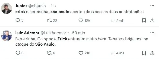 “Erick e ferreirinha, São Paulo acertou dms nessas duas contratações”, escreveu um torcedor nas redes sociais. “Ferreirinha, Galoppo e Erick entraram muito bem. Teremos briga boa no ataque do São Paulo“, escreveu outro torcedor.