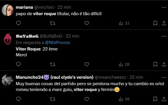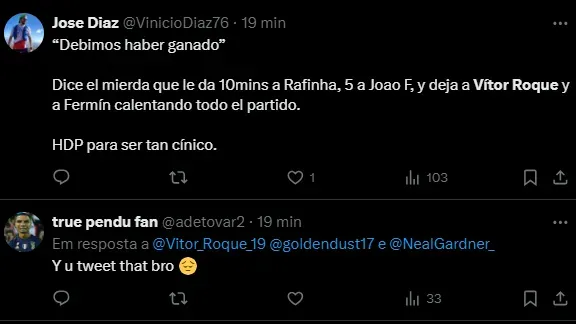 A torcida blaugrana está chateada com o fato de o jovem Vitor Roque ter ficado o tempo todo no banco de reservas hoje. Xavi Hernández decidiu não acionar o prodígio ex-Athletico.