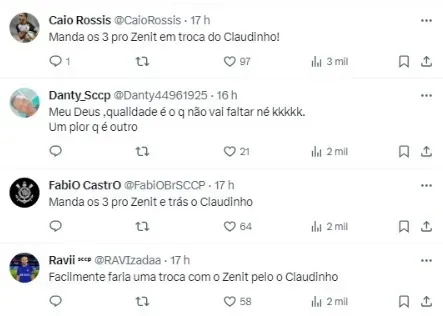 Nessa linha, a torcida corinthiana sugeriu que Augusto Melo fizesse uma troca: oferecesse o trio acima citado e garantisse o retorno de Claudinho, do Zenit, que interessa bastante neste momento ao Timão.