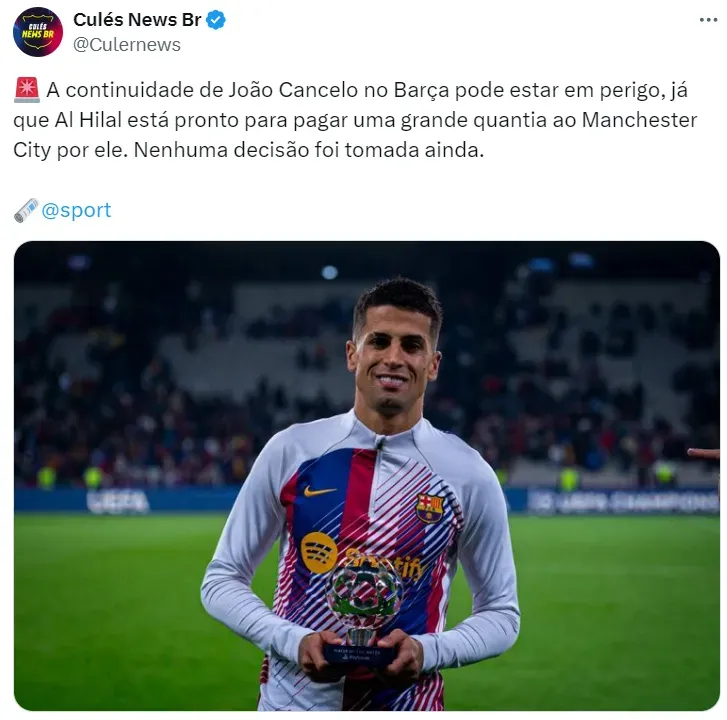 O sinal de alerta também é ligado para João Cancelo, lateral, que pertence ao Man City e está emprestado ao Barça até o final da temporada. O clube espanhol deseja mantê-lo, mas pode ver o jogador no Al-Hilal.