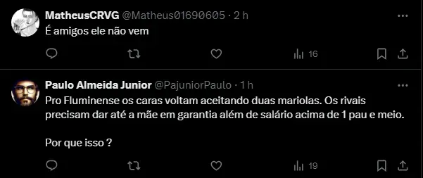 Por outro lado, o diretor de futebol da equipe ainda falou que o acordo não tem uma previsão para acontece, mesmo que o atleta aceite reduzir o sálario: “Se isso vai demorar muito mais ou muito pouco, depende de uma série de outras questões. Mas o fato de ele querer estar aqui é muito forte para que essa negociação caminhe bem”, completou.
