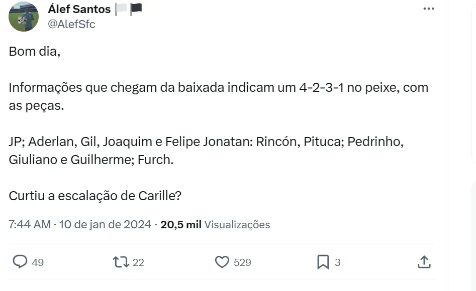 Vale reforçar que o Peixe ainda busca um goleiro para fechar o ciclo de contratações na atual janela. A saída de três arqueiros dos planos da comissão técnica indicam uma urgência no setor.