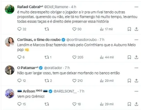 “Os dois clubes fizeram a mesma proposta ao Fla pelo lateral, mas o Rubro-Negro não quer fazer negócio com o Timão (por conta da condução dos paulistas no caso envolvendo Matheuzinho, com direito a nota oficial)”, prosseguiu.