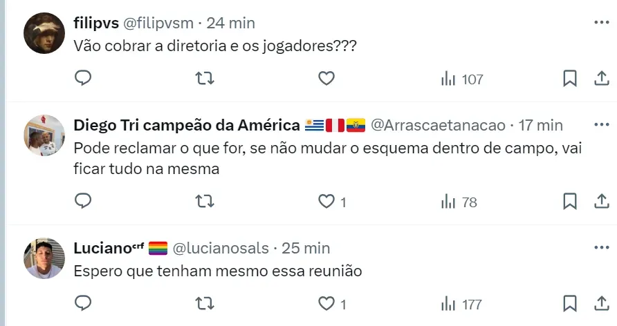 No entanto, Landim e Braz não estão satisfeitos com o desempenho da equipe e terá uma conversa com o técnico: “Informação que eu tenho é que ele não balança neste momento, mas a diretoria vai cobrar o Tite”, explicou o repórter em seu canal no Youtube.