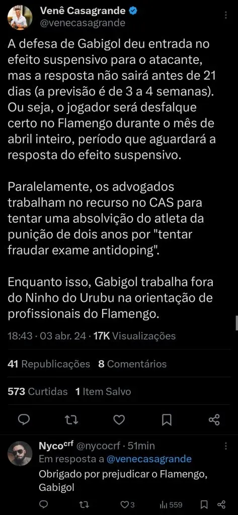 Nesta quarta-feira (3), o jornalista Venê Casagrande trouxe uma atualização importante em relação ao passo que está tomando a defesa do jogador.