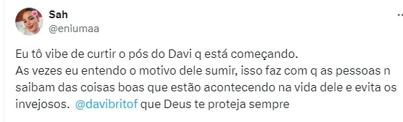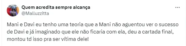 Vale lembrar que Mani decidiu romper com Davi após algumas declarações polêmicas feitas pelo ex-BBB após o fim do confinamento no reality global.