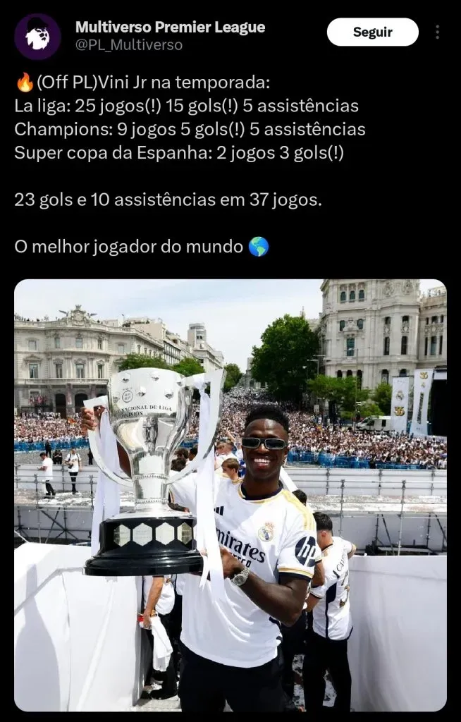 Artilheiro do Real Madrid na temporada, Vini Jr está entre os concorrentes ao prêmio de melhor jogador da La Liga. Com 16 gols marcados, ele está em 6º na briga pela artilharia da competição.